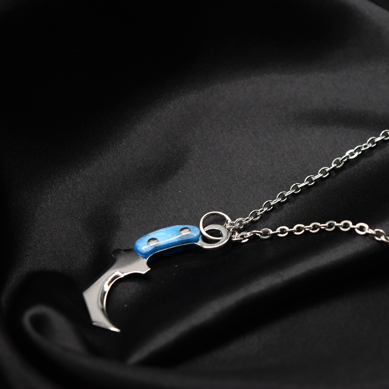 アクセサリーのメインとなるチャームは、すべて手作業で加工し、独自の技法を用いて仕上げています。ナイフのような鋭さを感じさせるカランビット風のペンダントや、シンプルながらも妖艶な輝きを放つブルーハートのチャームなど、細部にまでこだわったデザインが特徴です。